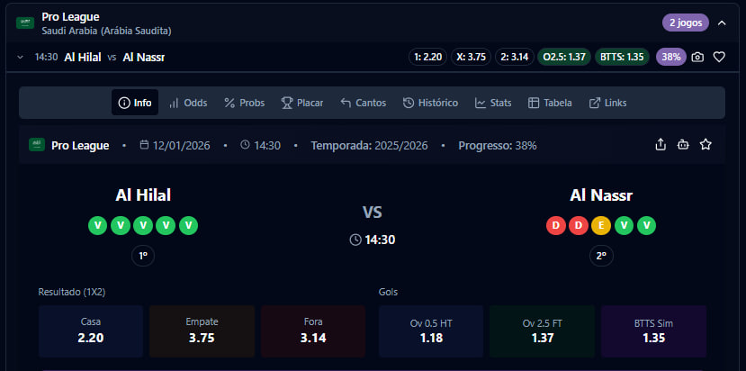 🔎 Análise do jogo Al Hilal x Al Nassr: Scanner aponta Valor (+10%) e DNB a 1.78